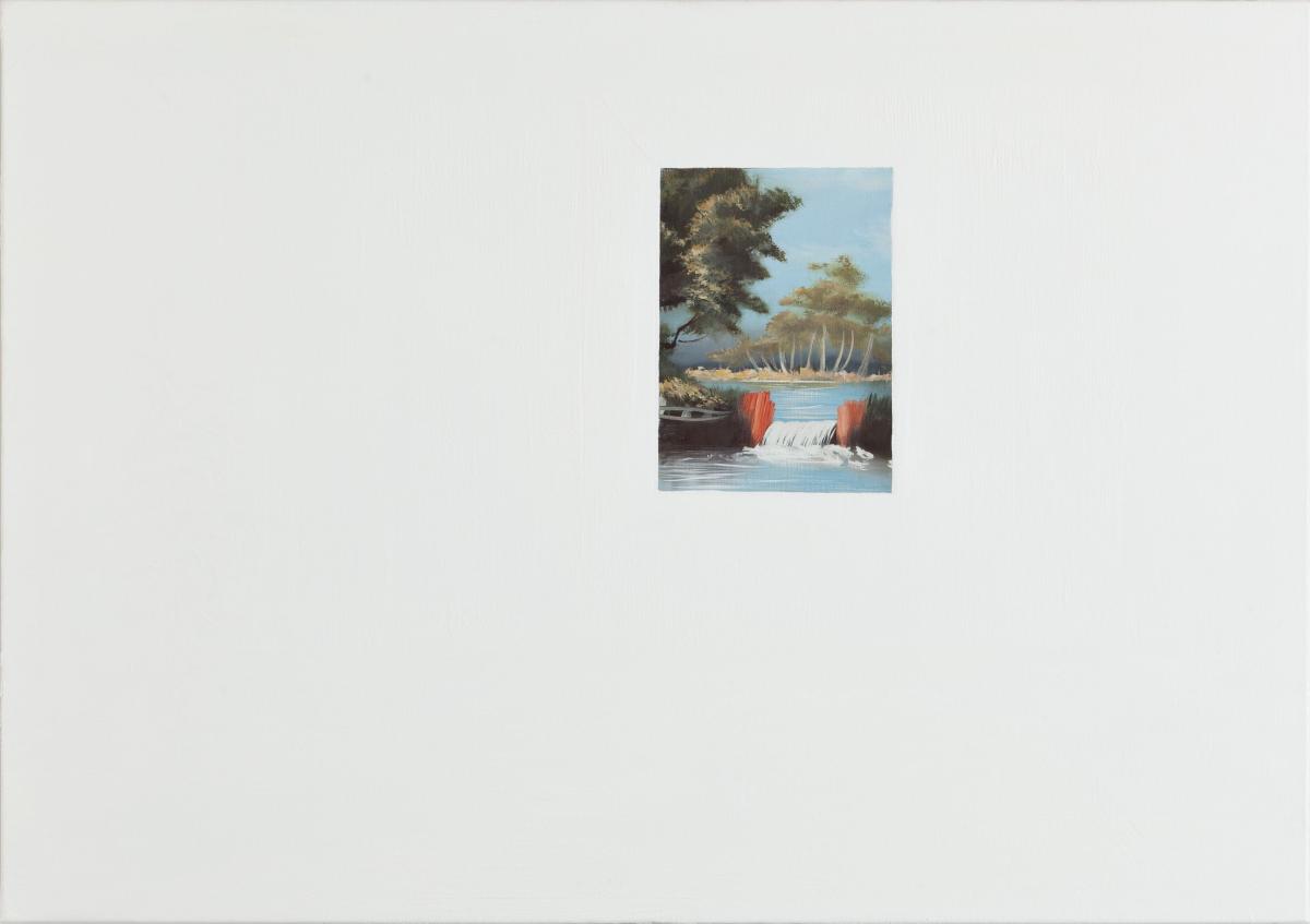 Het doek links (A4-P21) was oorspronkelijk een schilderij dat Gauthier Hubert op een vlooienmarkt had ontdekt en op A4-formaat had uitgesneden. De kunstenaar bedekte het hier en daar met witte verf in verschillende nuances, om het er als een schilderijenkabinet te doen uitzien; de werken die er ophangen, zijn als evenzoveel vensters die naar de oorspronkelijke achtergrond openen. Op het doek rechts (A0-L1) heeft Hubert het oorspronkelijke schilderij opnieuw gekopieerd en omrand met een imposante witte lijst waarin hij bijna onzichtbare motieven heeft geschetst. Het A4-P21-formaat stemt overeen met dat van het werk dat in A0-L1 is gereproduceerd en dat, afgeboord met wit, 16 maal groter wordt. In deze diptiek neemt de kunstenaar handig een loopje met de codes van de schilderkunst, de afmetingen die met de hiërarchie van de genres worden geassocieerd, de marktwaarde, ‘goede’ en ‘slechte’ schilderkunst. Voor Gauthier Hubert is “elk schilderij een performatieve daad, maar tegelijkertijd altijd een spel”.