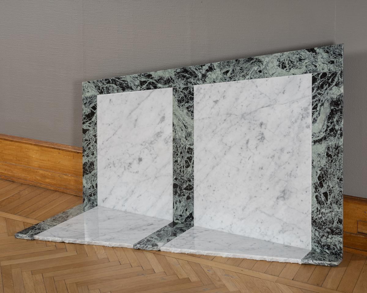 Zondagnamiddag in Berlijn behoort tot een reeks marmeren kunstwerken die Lili Dujourie tussen eind jaren 1980 en begin jaren 1990 maakte en die ze vaak opstelde aan de samenkomst van muur en vloer. De plastische taal van de kunstenares neigt naar minimalisme. Haar belangstelling gaat uit naar de directe eigenschappen van haar installaties, die het midden houden tussen schilderkunst en beeldhouwkunst: eenvoudige geometrische vormen, sobere kleuren, een edel materiaal. Deze objecten moeten met het lichaam worden verkend, ze moeten samen met de ruimte worden beleefd. Maar in tegenstelling tot het minimalisme wekken ze een heel subjectieve gevoeligheid op: die van de kunstenares, van haar geheugen. Zondagnamiddag in Berlijn evoceert de poëtische herinnering aan een echt beleefd ogenblik, een vluchtig moment: licht valt een venster binnen en werpt zijn schaduw op de vloer. De installatie vertaalt Dujouries voorliefde voor het verhaal, voor het theatrale – noties die de kunstenares in de jaren 1980 ook via grote fluweeldoeken uitdrukte.