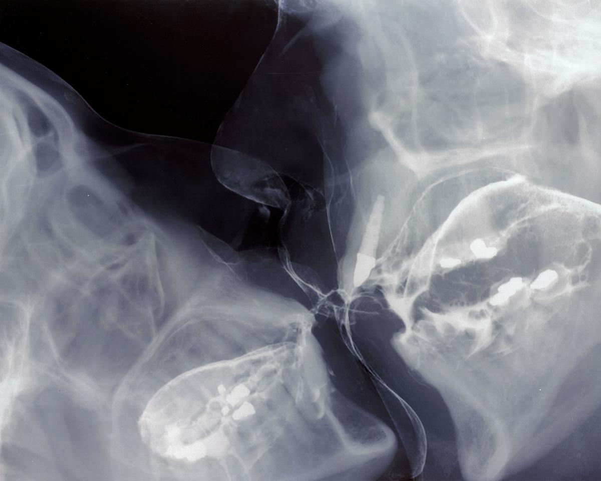 Radiografie van een kussend paar. De twee boven elkaar geplaatste kinnen geven de transparantie van het geschetste gezicht meer materie. Op deze Kiss 5 evoceert Wim Delvoye niet alleen de thema’s liefde en seksualiteit maar toont hij ons ook wat we niet kunnen zien: het inwendige van het lichaam en zijn functies. Net als in zijn Cloaca, een werk dat het menselijke spijsverteringsstelsel voorstelt, onthult hij de inwendige structuren van het organisme en toont hij zelfs prozaïsche details zoals tandvullingen en gebitsimplantaten. Delvoye behoort tot de bekendste hedendaagse Belgische kunstenaars. Hier behandelt hij een romantisch thema op een provocatieve en spottende manier, waarbij hij vooral zijn verhouding tot het typisch reële van de Belgische kunst wil uitdrukken, via de kloof tussen een voorstelling die erotisch wil zijn en de anatomie van de schedels die de dood symboliseren. Het afbeelden van skeletten en schedels, Vanitas genaamd, is een iconografische traditie overgeërfd uit de renaissance en vooral de barok. Kunstenaars als James Ensor of Delvaux waren erdoor gefascineerd. Schedels verwerkt in stillevens moesten de toeschouwer eraan herinneren dat het menselijke bestaan ijdel en vluchtig is. De serie Kiss van Delvoye toont de geneugten van het leven en de liefde, maar in de trant van een memento mori, “gedenk dat gij zult sterven”.