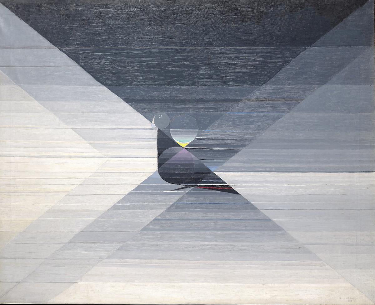 Op dit schilderij combineert Felix De Boeck geometrische figuratie met abstractie. De duif bevindt zich op de kruising van een net van diagonalen met uitwaaierend snijpunt. Horizontale stroken in grijs camaïeu, waarvan de lichteffecten door deze convergerende stralen worden gemoduleerd, versterken de manier waarop de compositie zich in één lichtpunt concentreert. Deze kern van energie wordt een ontmoetingsplaats van materie en geest. Het onderwerp lijkt in een moment van meditatie te zweven. Het punt, de lijn, de driehoek en de bol zijn universele symbolen die geregeld terugkeren in De Boecks oeuvre en die het een kosmische en spirituele dimensie verlenen. De kunstenaar werkt met liniaal en passer. Soms veroveren vernuftige combinaties van fijn in de materie gegraveerde cirkels de compositie, wat dan weer een invloed heeft op de algemene lezing van het werk. De Boeck is ook een schilder van het licht, of het nu diffuus of geconcentreerd is, of het nu bijdraagt tot de sfeer of, in zijn latere werken, tot de fosforescentie van de kleuren… altijd speelt het licht een bepalende rol.