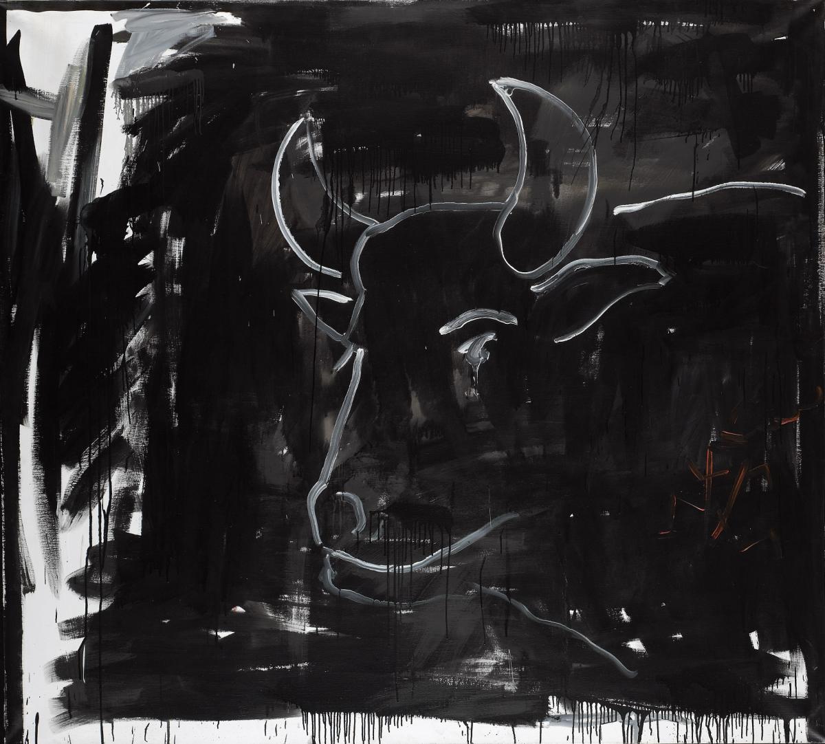 Walter Swennen was aanvankelijk dichter maar begon later te schilderen, in een stijl die in geen enkele categorie kan worden ondergebracht, met een eigenzinnig gevoel voor humor dat aan het surrealisme doet denken. Zijn inspiratiebronnen gaan van strips en literatuur tot woordenboeken en kindertekeningen. Zijn beelden vallen op door hun banaliteit: een punt kaas, een vliegtuig, een zaag. Maar zijn voorliefde voor marginaliteit, voor het absurde, voor het afwijkende maakt deze werken minder onschuldig dan op het eerste gezicht lijkt. Deze tekening, waarvan de lijnen aan het stripverhaal zijn ontleend, verwerft door haar heldere evidentie de status van archetype. De kop van de stier, die meer is dan louter een verwijzing naar de grotkunst, sluit hier perfect bij aan. De kleur speelt een al even grote rol als het teken. De donkere, met grove penseelstreken opgebrachte achtergrond bedekt het doek niet volledig en laat de overschilderingen en de bewuste aarzelingen zien die het verhaal achter dit werk vormen.
