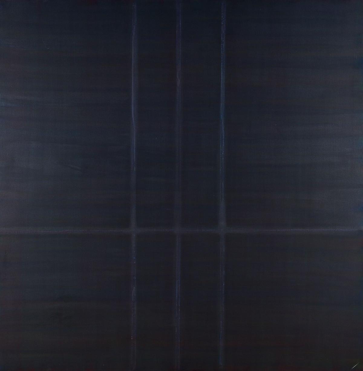In de jaren 1970 verkende de beweging Supports/Surfaces nieuwe creatieve mogelijkheden: doeken zonder raam, willekeurige uitsnijdingen… In die context stellen de werken niets anders voor dan hun materiële realiteit (een doek, pigmenten, vormen). Met zijn Trilogie 2 sluit Michel Mouffe zich volledig bij deze visie aan. Dit ogenschijnlijk stille schilderij heeft toch veel te vertellen: achter de traditionele lijst en een nagenoeg monochrome behandeling ontdekt het opmerkzame oog een onderliggende archeologie. Het raamwerk wordt immers geschraagd door oordeelkundig geplaatste metalen of houten dwarsbalken die hun aanwezigheid op diverse manieren van onder het doek laten aanvoelen. Zo laat het metaal, in contact gebracht met vooraf vochtig gemaakt doek, roestsporen na, of zelfs zwellingen, terwijl het hout vocht uit het schilderij trekt en discretere sporen op het oppervlak achterlaat. Talrijke fijne en vloeiende toetsen acrylverf vormen gekruiste, gekoppelde of gescheiden banden die met brede en platte penselen zijn aangebracht. Hun gelaagde transparanties scheppen een effen oppervlak waardoorheen de kleur blijft zinderen, in het volle besef dat ze niets anders dan licht is.